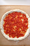 フォークで軽く空気を抜き、ピザソースを薄く塗る。